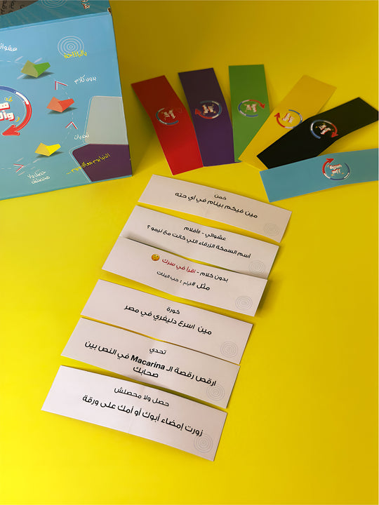 بوكس واحد فيه ٦ ألعاب جماعية مختلفة—كل لعبة لها قوانين بسيطة وتحديات سريعة ومضحكة، من حركة وسرعة لأسئلة وجرأة.